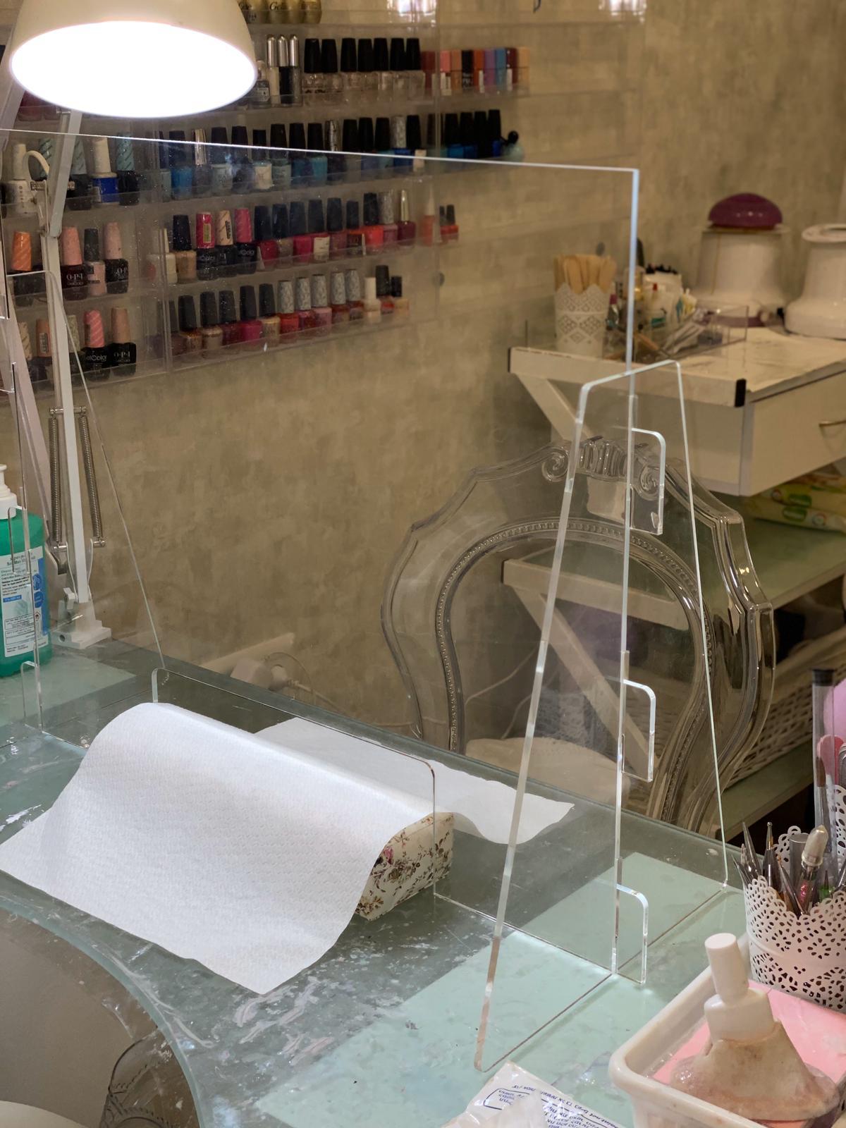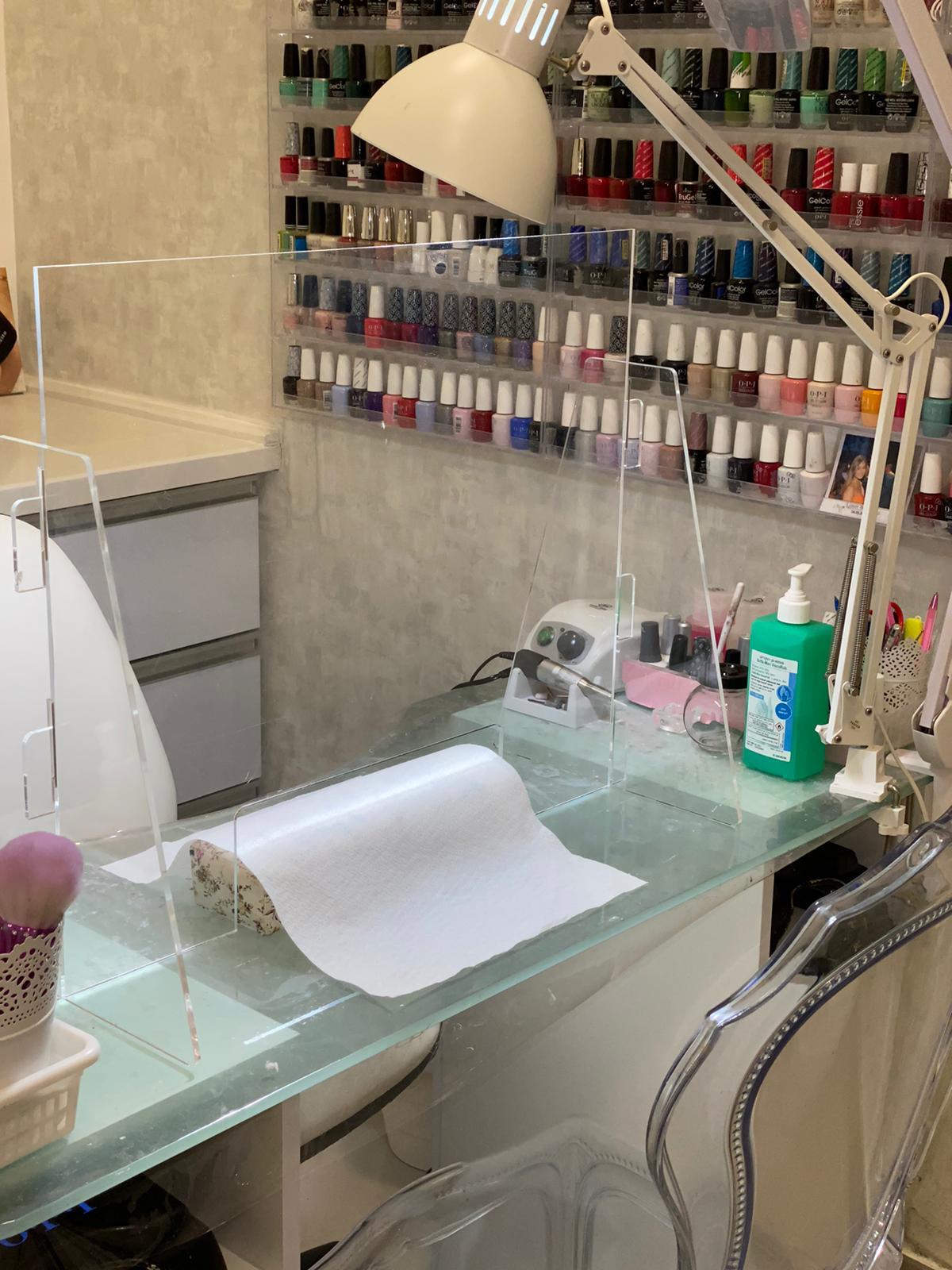 מיועדת במיוחד לקוסמטיקאית / בניית ציפורניים. המחיצה עומדת על השולחן עם רגליות עשויות ממפרספקס שקוף תואם.