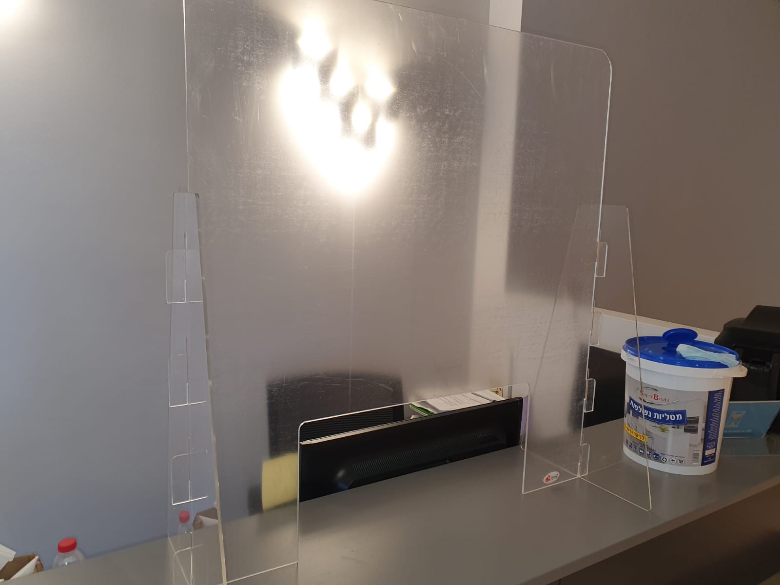 מחיצת מגן שקופה ואלגנטית מפרספקס שקוף לחלוטין בעובי 3 מ״מ. מסייעת להגנה, חוסמת מפני נתזי רוק והתעטשות וניתנת לחיטוי ורחיצה.
